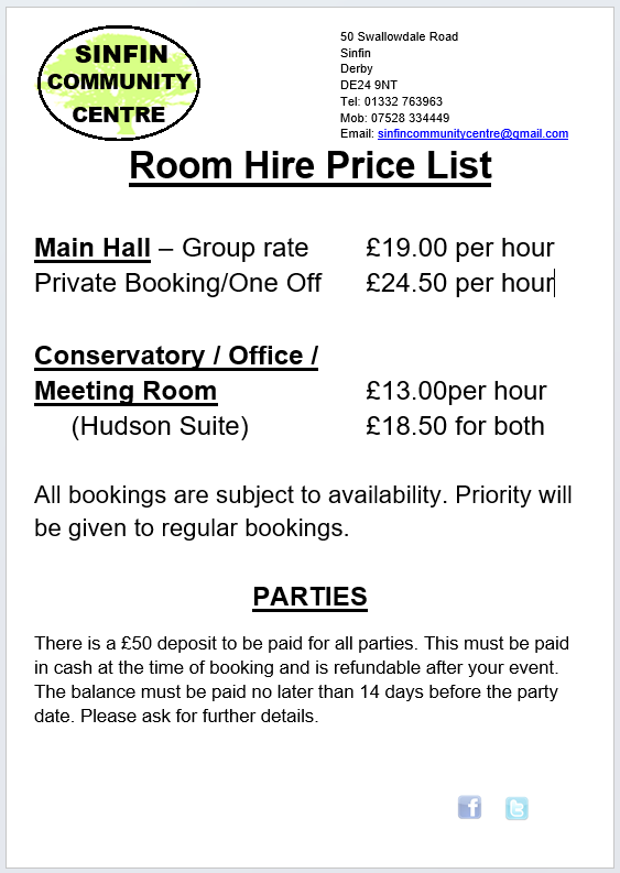 We offer various spaces for hire, from small meeting rooms for up to 10/12 people, to the main Hall for up to 100. Whatever your space needs we usually have something we can make work.