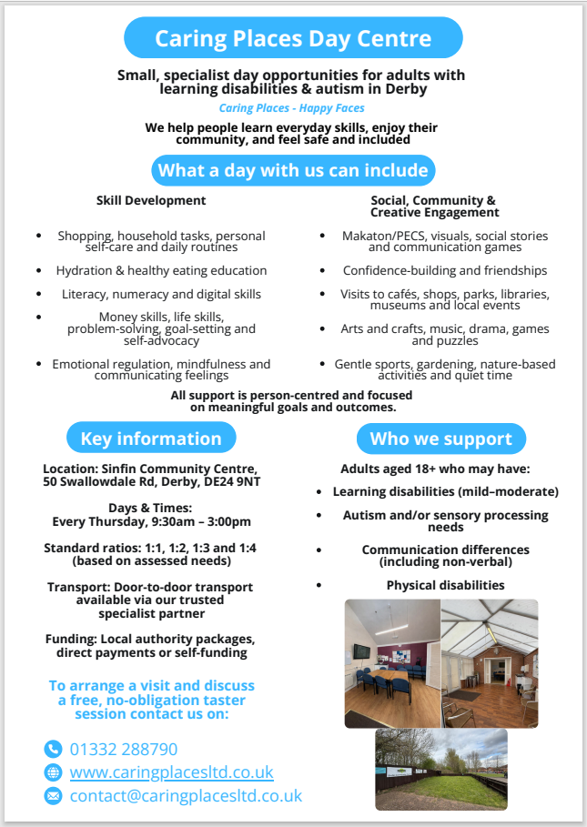 - Thursday 9am – 3pm ~ Caring Places – Adults with learning disabilities day centre